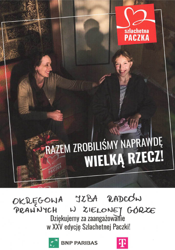 W dniu 13.12.2025 r. dostarczyliśmy do magazynu Szlachetnej Paczki w Strzelcach Krajeńskich 20 paczek przygotowanych ze zbiórki prowadzanej wśród radców prawnych naszej Izby. Wpłaty radców prawnych pozwoliły nam, z nawiązką, zaspokoić wszystkie potrzeby jakie zgłosiła wybrana przez naszą Izbę Rodzina.